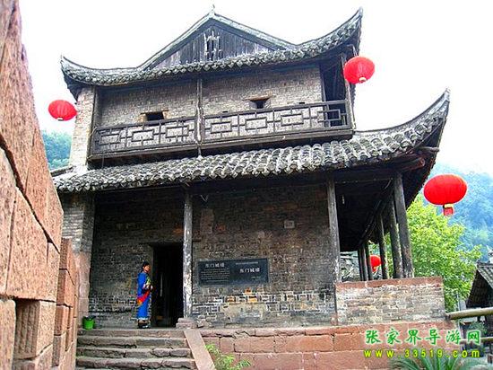 東門城樓始建于清康熙五十四年(1715年),城門下部由紫紅砂巖砌成,上部城樓則用古磚砌筑。城門寬3.5米,高4米,呈半圓拱,兩扇城門都用鐵皮包裹,用圓頭鐵釘密釘,牢實(shí)堅(jiān)固。城墻修筑全部用紅砂條石,精工細(xì)鉆,規(guī)格一致,城墻厚0.8米,下部內(nèi)外兩側(cè)用條石加石灰漿砌成,中間填以碎石粘土,層層夯實(shí);頂部的中間填充物改為石灰、鵝卵石、黃土拌成的三合土,厚約0.33米,上面鋪以紅砂塊石。城樓高11米,大門上方有槍眼8孔。歇山屋頂,覆以腰檐,飛檐翹角,精美壯觀。