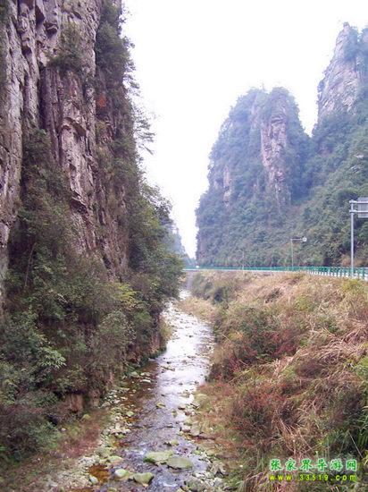 百丈峽是武陵源風(fēng)景名勝區(qū)通往張家界市的公路貫通整個(gè)峽谷,因有堵高近百丈的石壁,直插云霄,不敢仰視,故而得名。據(jù)《慈利縣志》載,索溪峪右得百丈峽,峽長(zhǎng)三十公里……又相傳向王天子起義軍與官兵在此先后博殺一百仗,依此又名百仗峽。明代九永兵備胡桂芳,一生好游歷山川,來(lái)到百丈峽后題寫了一首七言詩(shī):“峽高百丈洞云深,要識(shí)桃源此處尋;戎旅徐行風(fēng)雪緊,誰(shuí)將興盡類山蔭。”刻于峽內(nèi)道旁石壁上。