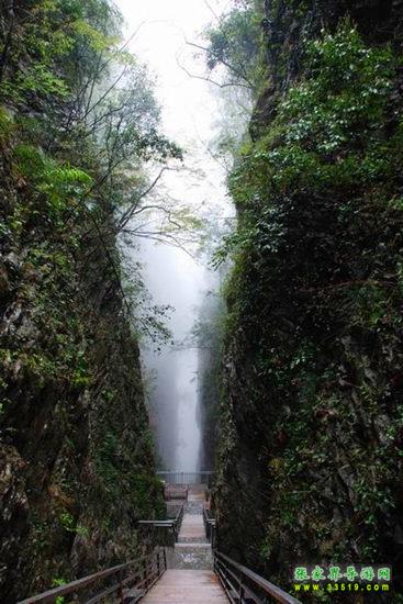 【天梯棧道】我們現(xiàn)在所步行的這段游道坡度很大,棧道的木板很窄,依次往下延伸,就像一架天梯,把我們送往迷人的仙境。我們叫它天梯棧道。各位來(lái)賓,梯陡人多,大家一定要慢一點(diǎn)啊,一定要注意安全??!