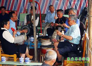 圍鼓(含嗩吶)。又稱打鎦子、打排鼓,是民間紅白會中不可缺少的樂器。一般7人演奏,樂器有一鼓、一大鑼、一公鑼、兩副鈸、兩嗩吶。其詞曲紅白會通用,以鼓和嗩吶上系紅、白布為分別標記(結婚不打四字鈸曲)。史傳的圍鼓詞有《撩子》、《火鋪》等,《撩子》分《一二三》、《閃翅》、《堆羅漢》、《反落花》等十章,《火鋪》也分《三槍》、《四進門》、《八哥洗澡》、《蓮魚吐絲》等十章,嗩吶詞有《八十正宮》調等。在農村,圍鼓是最普及的樂器,每逢紅白喜事都有圍鼓和嗩吶表演。