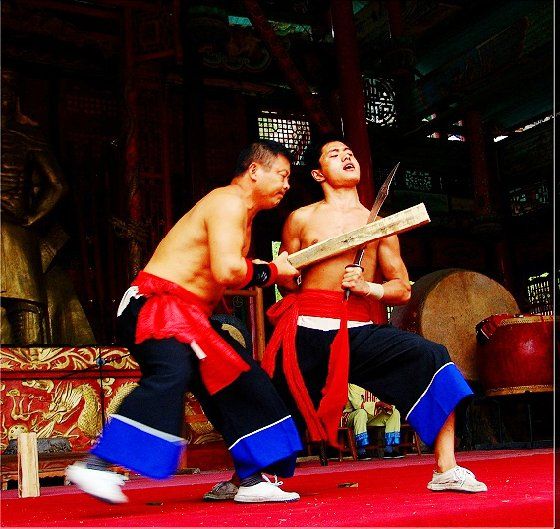 大庸氣,堪稱武林奇葩,曾為祖國贏得聲譽(yù),海內(nèi)外享有極主名望。 大庸氣功是大庸各民族特別是土家族傳統(tǒng)體育項 目之了,分健體氣派、武術(shù)氣功兩類。前者有“返還 功”、“馬王推氣功”、“少林達(dá)摩醫(yī)療保健氣功” 等;后者有靜坐、壁虎、靈子、二指彈、碎石、松靜 、硬氣、五禽、五陽功等,尤以硬氣功著稱。大庸硬 氣功,歷史悠久,漢代相單程,明代覃后,清代劉明 燈,當(dāng)代湯子模、周鐵鞭、杜心武、趙繼書等都具有 超人硬氣武功。大庸土著民族在漫長的反征服、反壓 迫斗爭,博采武當(dāng)、少林南北派、昆侖派眾家武林精 華,創(chuàng)造出獨此一家的大庸硬氣功。 據(jù)傳,大庸硬氣功鼻祖是楚國鬼谷子?!队蓝h 志》有關(guān)鬼谷子隱居天門山鬼谷洞潛心學(xué)《易》、傳 授方術(shù)的記載。到清代有武林高手朱茂嶺,隱居三岔 村北芭蕉灣洞,研究鬼谷氣功之術(shù),后收西溪坪胡口 子、余世萬(即“余通人”)為徙,傳其衣缽。余通 人將武術(shù)氣功系統(tǒng)整理,發(fā)揚光大,播名于世。 新中國成立后,黨和政府十分重視民間氣功發(fā)掘 整理,并正式列為體育項目加以普及發(fā)展,今日大庸 市習(xí)練硬氣功達(dá)數(shù)萬人眾。永定區(qū)官黎坪村世有“硬 氣功之鄉(xiāng)”盛譽(yù),該村男女老幼,練功已蔚成風(fēng)氣, 其武師趙繼書,1979年先后參加全省和全國武術(shù)大賽 ,均獲一等獎,受到國家體委重視,同年7 月趙繼書 專程到北京給中央領(lǐng)導(dǎo)同志匯報表演。嗣后,隨同中 國武術(shù)代表團(tuán)和國家領(lǐng)導(dǎo)人先后兩次出國,到盧森堡 、意大利、比利時、羅馬尼亞、馬其他和東南亞等國 家訪問。他表演的臥刀碎石、頭頂開石、雙鳳灌耳、 頭碰石柱、叉尖推磨等精彩節(jié)目,博得外國友人好評 。盧森堡一位榮獲國家獎牌的武士,看了表演后連夜 來到中國大使館,將自己珍藏多年的獎牌贈送給他; 盧森堡國王主動熱情走上臺與趙繼書熱情擁抱,連連 稱贊:“了不起!了不起!國際氣功大師!”并把珍 藏紀(jì)念章一枚贈送給趙繼書。一位法國朋友十分贊賞 說:“中國的氣功,稱為全人類的寶貴財富,是有科 學(xué)道理的。”自此,大庸硬氣功譽(yù)滿全球。湖南瀟湘 電影制片廠專門拍攝了彩色紀(jì)錄片《大庸氣功》。 大庸硬氣功共有二十多個項目,最有影響的是: 腹臥鋼叉 由二人在地面扶住一根叉尖朝上的三 股鋼叉,叉尖猁鋒利,然后一個俯身叉尖,尖抵腹部 ,待其四肢平展懸空,扶叉二人轉(zhuǎn)動鋼叉,謂之推磨 。表演時,要求臥叉者運氣于腹,氣意集中,稍有大 意,叉即穿腹而過。 臥刀破石 先固定兩把大刀,刀口朝上,臥刀者 運氣后,由其他人抬臥于刀口上(有仰臥、俯臥兩種) ,然后在臥刀者腹部或背部置一碩大石條(約數(shù)百斤) ,一人或兩人輪大鐵錘狠擊石條直至斷裂破碎為止。 釘?shù)洞财剖?地上倒一層碎玻璃片,一人仰臥其 上;然后腹上置釘床,又一人仰臥釘床上,再于第二 人腹上置釘床,第三人仰臥刀床上,腹部上壓一塊數(shù) 百斤大條石,由人掄錘狠砸,至石破為止。 銀槍刺喉 用一根兩頭安有鋒利槍頭的鋼槍,抵 置兩位表演者喉部,然后相對發(fā)力,至槍桿抵成彎弓 形而喉部安然無恙。 徙手?jǐn)嗍?表演者將堅滑如鐵一塊卵石置于石凳 (地)上,然后運氣于掌或指擊斷(碎)卵石。 踢腿斬石 表演者運氣于腿,以腿踢斷石條。一 般可踢斷15公分以上厚度的麻石條或青石條。 胸部打刀 將鋒利大刀刃口置于胸部肌肉上,用 一根拳頭粗木棒猛擊刀背,至棒斷而胸部無傷。 新中國成立以來,大庸民間武術(shù)與民族體育逐漸 融為一體,發(fā)揮著提高人民身體素質(zhì)、弘揚中華武術(shù) 傳統(tǒng)和增進(jìn)國際友誼重大作用。除硬氣功外,還有數(shù) 十種武術(shù)形式散見于民間武術(shù)體育活動之中。如打飛 棒、扭扁擔(dān)、抵搭斗杠、擠油渣、甩抱腰、舉石鎖、 板牛角(一種斗牛形式)等等。其特點是因地制宜, 不分場地,凡田園地角院壩集鎮(zhèn),都是習(xí)武練功、開 展活動的處所,頗具泥土氣息。擬或以生活中某些動 作和動物的某種形態(tài),稍加模仿演繹,便成某一獨特 武術(shù)形式。如天門武術(shù)功夫大師余道人所創(chuàng)造的“宮 天梳”、“巖燕樸天門”等;也有就地理特點創(chuàng)造某 種武功形式的,如“蕩藤”等。