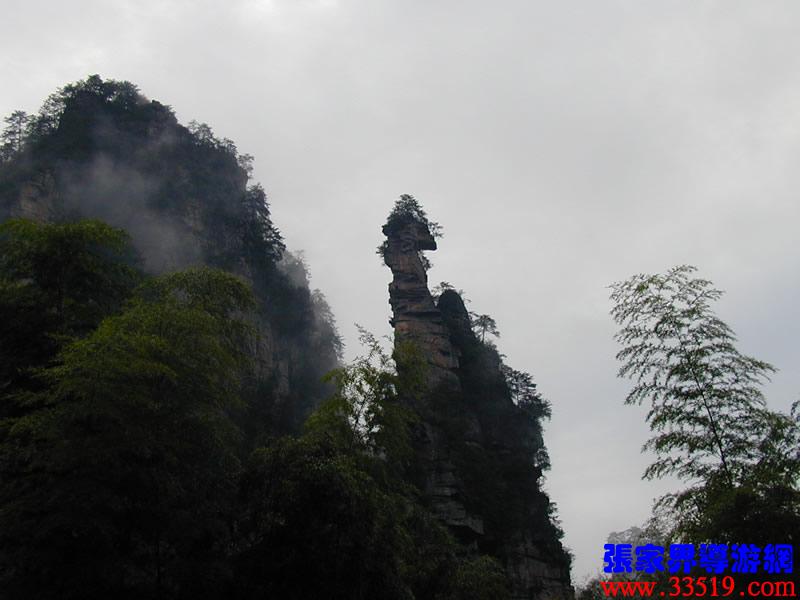 (定海神針)現(xiàn)在我們前方可看到一塊翠谷,每逢陰雨天氣,谷內(nèi)云翻霧涌似大海狂濤,谷底有一峰如中流砥柱巋然屹立于云霧之上,堅不可摧,因此得名定海神針;另在其西南百米外一峰似猴頭,縮頸握拳窺視,似孫悟空欲取此定海神針。