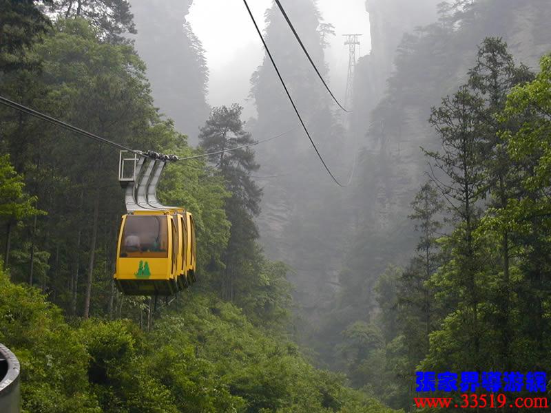 (索道站)現(xiàn)在,我們就要乘索道下山了。黃石寨(黃獅寨)索道是1995年5月至1997年9月臺灣證吉興業(yè)有限公司與張家界公園管理處合資興建的我市第一條觀光索道。索道線路水平距863,高差431米,運行速度每秒8米,單向小時運量948人,設備全部從法國波馬公司引進,總投資4000多萬人民幣。黃石寨(黃獅寨)索道的建成,為公園開辟了一條空中游覽線,填補了張家界無觀光索道的空白。古詩說:會當凌絕頂,一覽眾山小。乘索道觀張家界公園,別是一番感受。