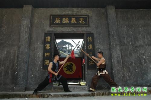 忠義鏢局,它始建于清乾隆四十二年(1777),位于洪江龍船沖,這里會館、錢莊、豪宅林立,堪稱洪江的曼哈頓。與我們在古商城看到的窨子屋不同,這是一座典型的北方四合院,前庭后院,布局嚴(yán)謹(jǐn),軸線明確,左右對稱,主次分明。前院是鏢師練功習(xí)武之地,墻壁上書有“忠”、“孝”、“禮”、“義”四字和“十八羅漢練功圖”;后院為鏢師起居和洽談生意之所,內(nèi)供奉關(guān)武大帝。忠義鏢局主要為豪商巨賈押運(yùn)銀票、貨物,看家護(hù)院,坐夜守店,也開館收徒,傳授武藝。忠義鏢局的掌門人劉大鵬,湖南長沙人,幼時即入嵩山少林寺習(xí)武,不僅精通十八般武藝,而且頭腦精明,他把鏢局開在這洪江最繁華的金融一條街,足見他的經(jīng)商意識和人面廣了。現(xiàn)在忠義鏢局現(xiàn)場表演古代押鏢、行鏢全過程,是人們了解中國古代鏢行歷史文化的活性博物館。有興趣的朋友可以去洪江古商城親自感受一下當(dāng)時押鏢的情景吧。