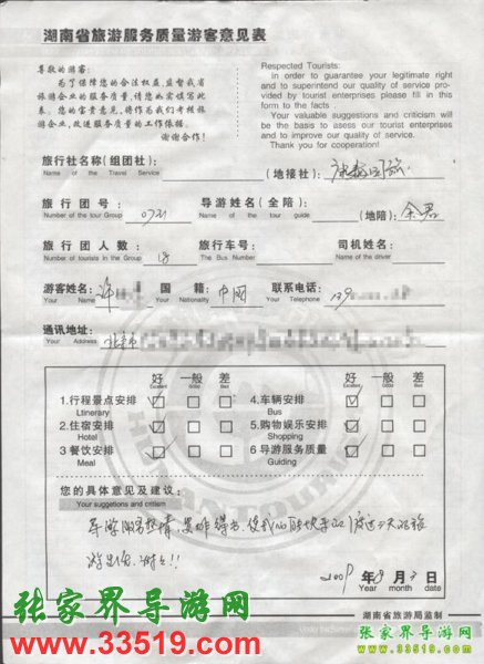 2009年7月31日北京許先生一行18人接待質(zhì)量反饋單:
