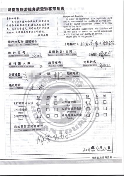 2011年4月23日李先生旅游質(zhì)量反饋:服務(wù)很好