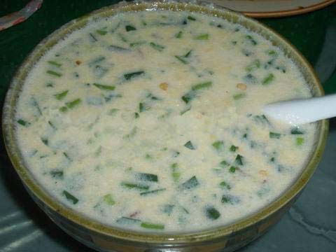將用水浸泡過的黃豆用磨子磨碎,摻入切細的青菜葉,然后用溫火煮熟即可。此樣菜雖做法簡單,但營養(yǎng)價值極高且味鮮美,為當?shù)厝顺S玫囊坏啦恕?/p>